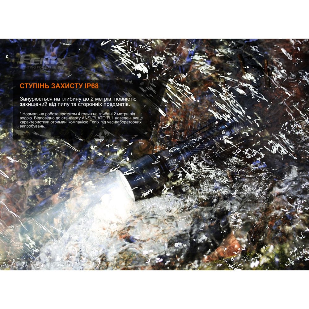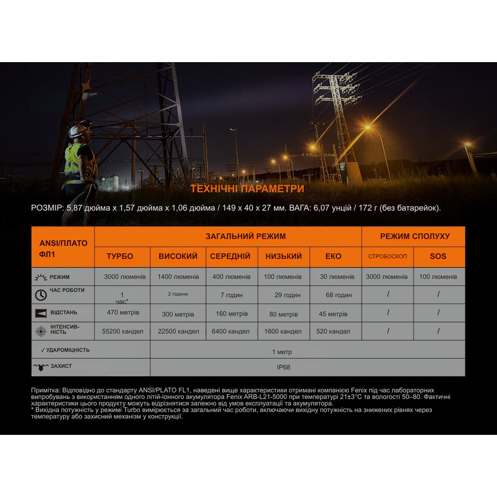 Ліхтар Fenix C7, акумулятор ARB-L21-5000 (21700), зарядний кабель USB Type-C, темляк, запасне ущільнювальне кільце, посібник користувача та гарантія.