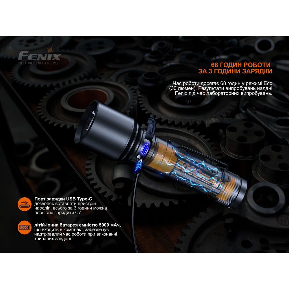 Перезаряджуваний ручний ліхтар Fenix C7 розрахований на побутове застосування та на професійні завдання, де потрібне потужне та автономне джерело світла. В основі — білий світлодіод Luminus SST70 з піковою яскравістю 3000 лм та дальністю променя до 470 м. Ресурс світлодіода сягає 50 000 годин.