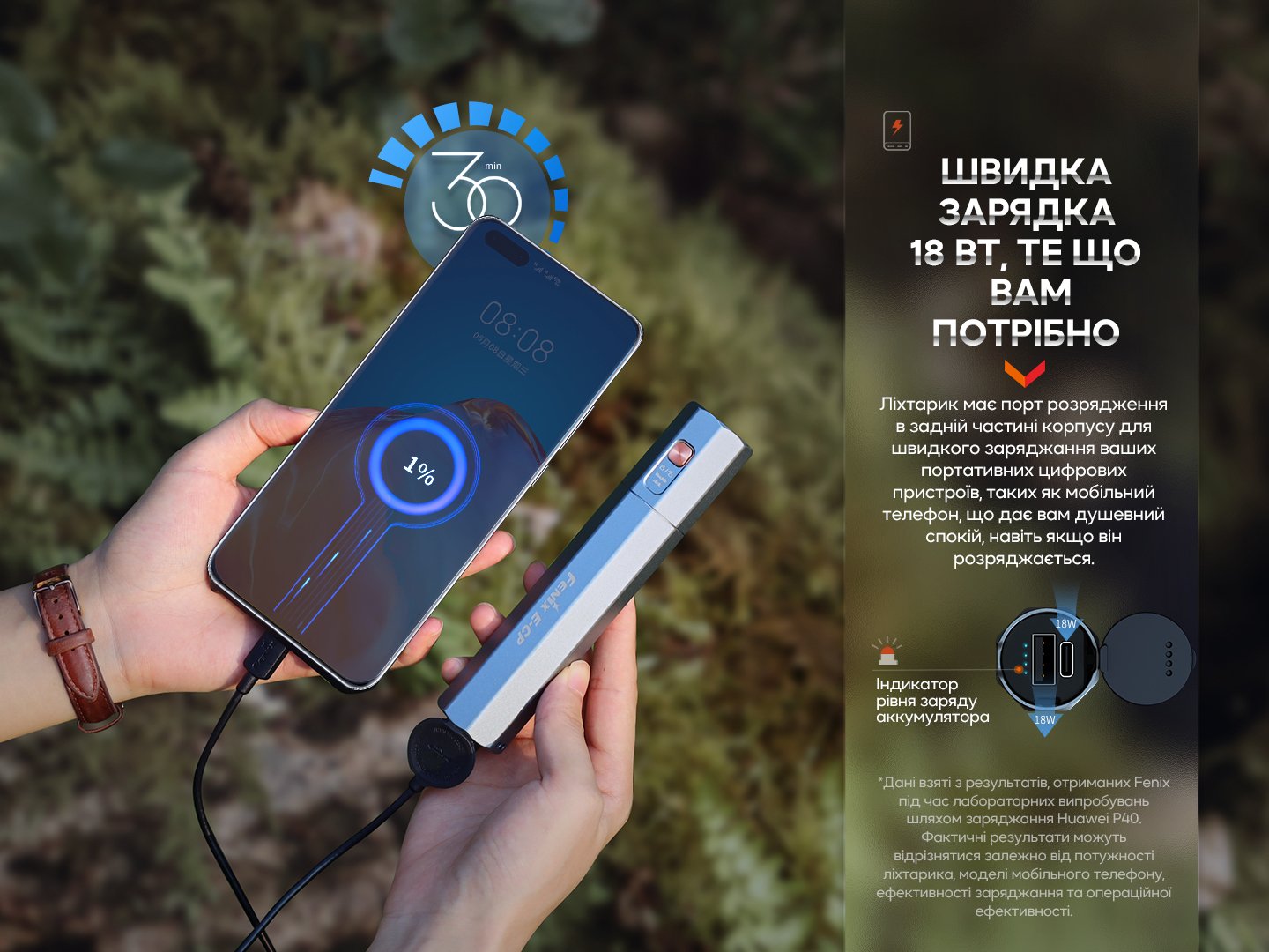 Примітка: показники світіння моделі ґрунтуються на результатах, отриманих фірмою Fenix під час лабораторних дослідів із застосуванням літій-іонного акумулятора ємністю 5000mAh при температурі 21±3°C та вологості 50% - 80%. Реальні параметри роботи ліхтаря можуть відрізнятися залежно від різних умов зовнішнього середовища та акумулятора, що застосовується.