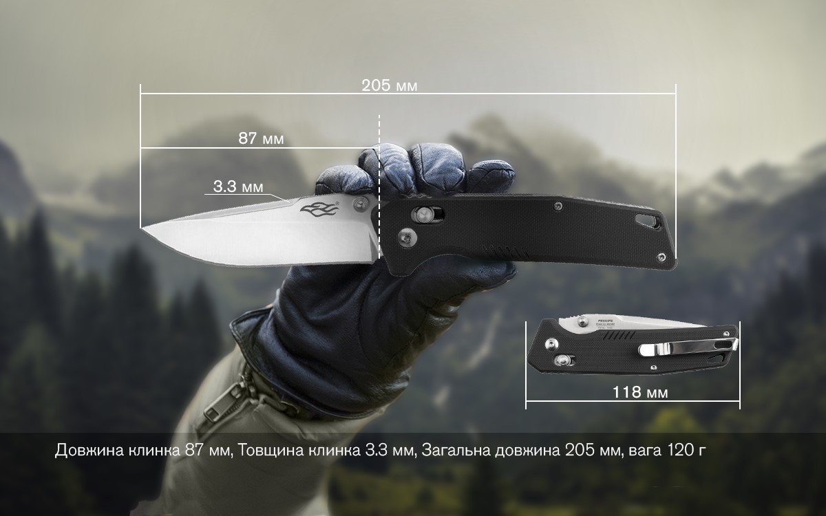 - повна довжина ножа FB7601 — 205 мм, а розмір клинка — 87 мм;
