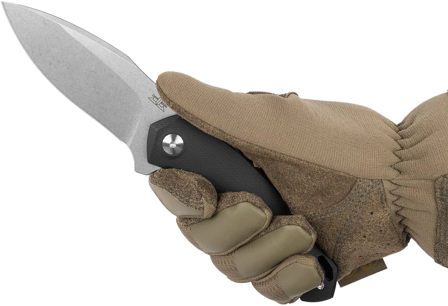 Перфоровані титанові лайнери та бекспейсер надають більшої міцності загальній конструкції, але не обтяжують її. Накладки на руків’ї виконані з склотекстоліту G-10 з нековзкою 3D обробкою. Ергономічна форма руків’я та підпальцеві виїмки гарантують комфортне розміщення в руці та надійних хват. На торці розміщений об’ємний отвір для темляка та фрезована титанова кліпса.