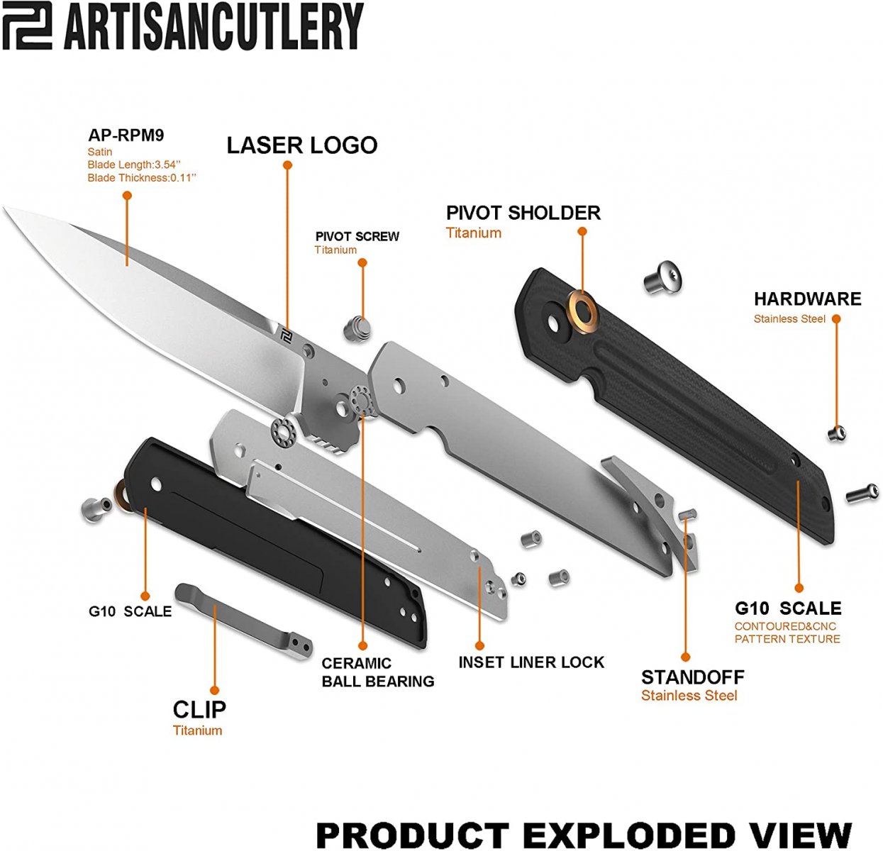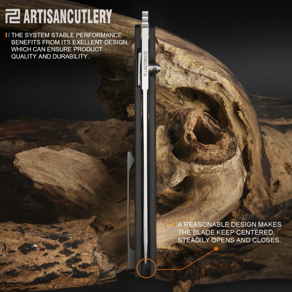 Клинок профілю Drop point виконаний з фірмової порошкової сталі компанії — AR-RPM9 (Artisan-Rare Powdered Material 9 Element Steel), яка була розроблена спеціально для створення лінійки ножів з більш доступною ціною. Ексклюзивна сталь має однорідну структуру, яка дозволяє зберігати ріжучу крайку гострої протягом тривалого періоду. Також дана сталь проста у виправленні й відмінно витримує навантаження. Клинок має прямі спуски практично від самого обуха. У робоче положення приводиться за допомогою шпенька й надійно фіксується сталевою пластиною замка Liner lock. Наявність системи керамічних шарикопідшипників забезпечує плавний вихід клинка.