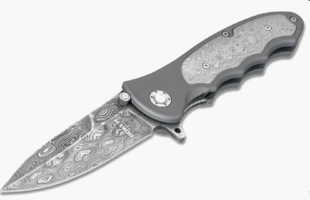 Легендарний складаний ніж Boker Leopard має унікальну історію. Дамаск клинка з 180 шарів був створений зі сталь стовбура німецького танка Leopard часів Другої Світової Війни, що робить цей ніж унікальним придбанням у колекцію. Рукоять багатого виду виконана з алюмінієвого сплаву й містить вставки з дамаска. Відкриття ножа виконується за допомогою шпенька або фліппера. Для зручності на рукояті присутня кліпса, переставляється у два положення. Boker Leopard поставляється в дерев'яному футлярі із сертифікатом дійсності.
