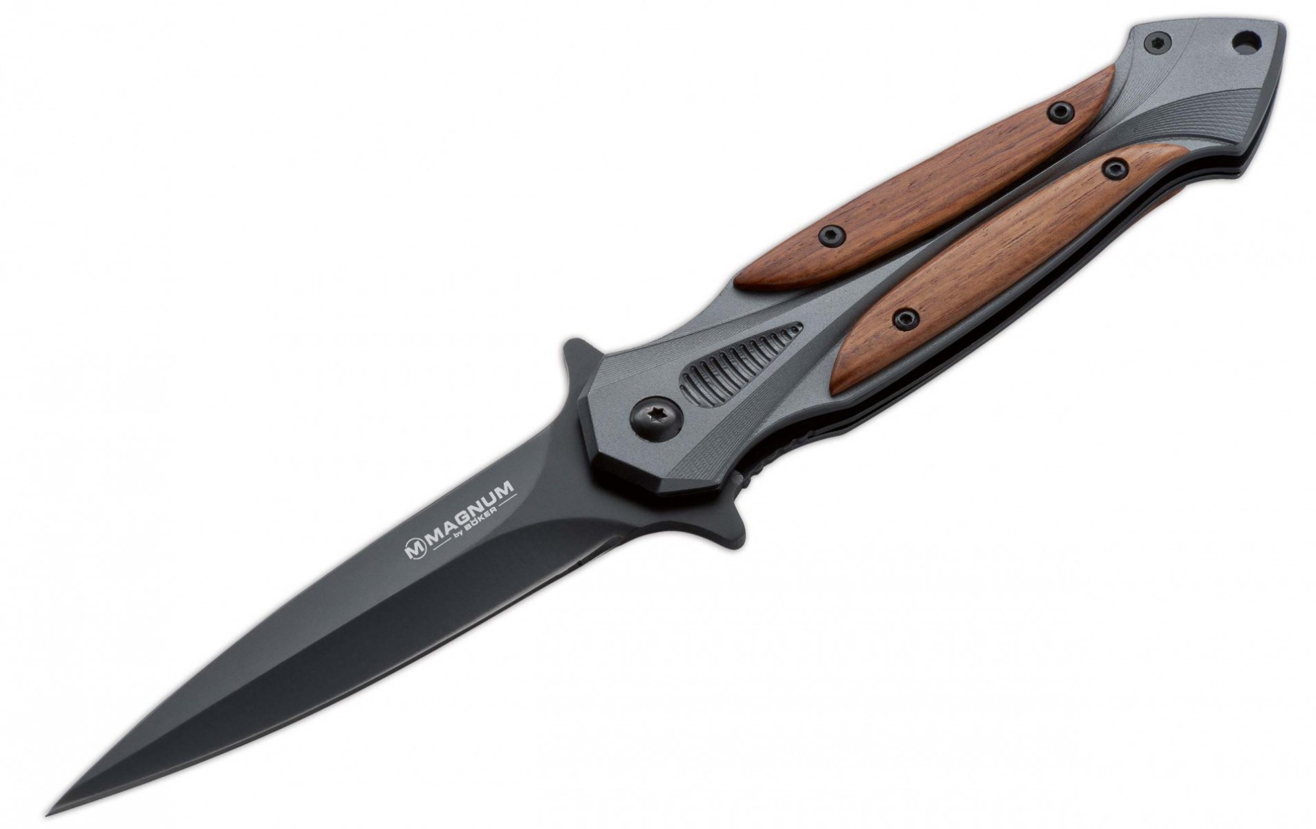 Складаний ніж Boker Magnum Starfighter виконаний у вигляді кинджала. Клинок з нержавіючої сталі 440 має чорне антикорозійне покриття й прекрасно гармоніює з дерев'яними накладками рукояті. Ніж приводиться в робоче положення за допомогою фліппера, який також виконує роль гарди й запобігає зісковзування пальців руки на клинок. Оснащений зручною кліпсою й отвором для кріплення темляка.
