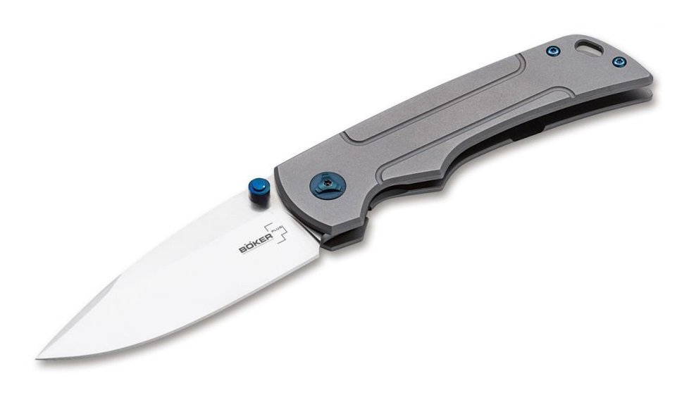 Складний ніж Boker Plus Gulo Pro розроблений ножовим майстром Стівом Келлі разом з B проker Manufaktur Solingen і призначений для щоденного носіння. Сатинований клинок типу Drop point виготовлений зі сталі D2, здатної довгий час зберігати гостроту ріжучої крайки. Завдяки шарикопідшипнику він легко витягується однієї рукою за допомогою шпенька й надійно фіксується замком Frame lock. Накладки рукояті виконані з нержавіючої сталі. Є знімна кишенькова кліпса й отвір для кріплення темляка. Гвинти, шпенек і кишенькова кліпса анодирувані в синій колір, творець приємний контраст зі сріблистим відтінком рукояті.