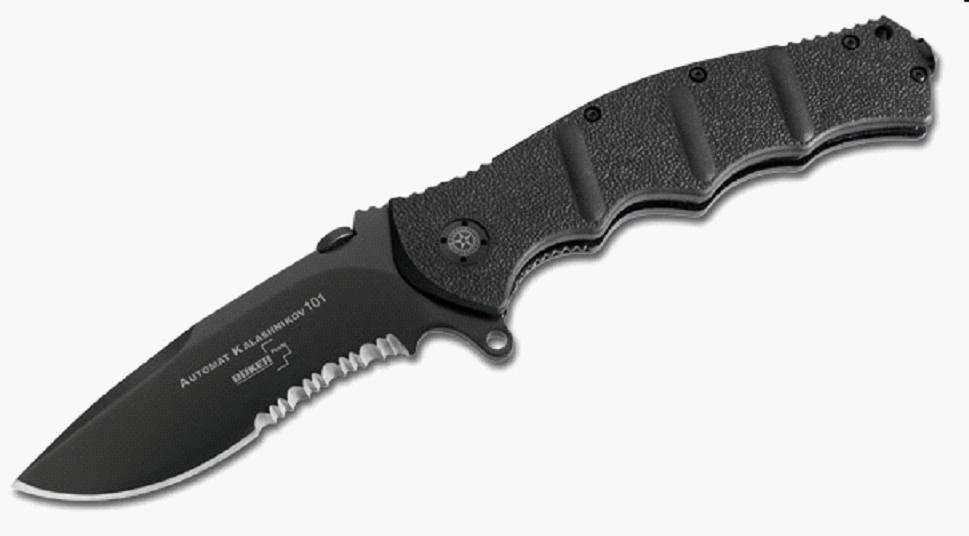 Серія ножів AK101 присвячена Автомату Калашникова 100й серії. Усі ножі, носити ім'я Калашникова, офіційно ліцензовані. АК101 – потужний ніж із клинком 10 см., добре підійде для полювання, походів і будь-яких екстремальних ситуацій. Рукоять ножа із пластику FRN (нейлон посилений додаванням скловолокна) завдяки своїй формі, текстурі й наявності упору для великого пальця з насічкою забезпечує певен і комфортне втримання ножа в будь-яких умовах. Під накладками конструкція рукояті посилена за рахунок сталевих пластин товщиною 1,5 мм. Виступ у підставі клинка, «фліппер», дозволяє швидко відкрити ніж, а після відкриття - відіграє роль гарди для захисту пальців. Крім «фліппера» клинок можна акуратно відкрити пальцем (навіть у рукавичці) за допомогою спеціального упору – диска на обуху клинка. Клинок зроблено зі сталі 440С, його вигнута форма з невеликим «черевом» дозволяє комфортно різати всілякі матеріали. Для екстрених ситуацій у рукояті ножа встановлений склобій. Замок ножа – « лайнер-лок», кліпса пограє носити ніж у кишені в положенні вістрям клинка нагору.