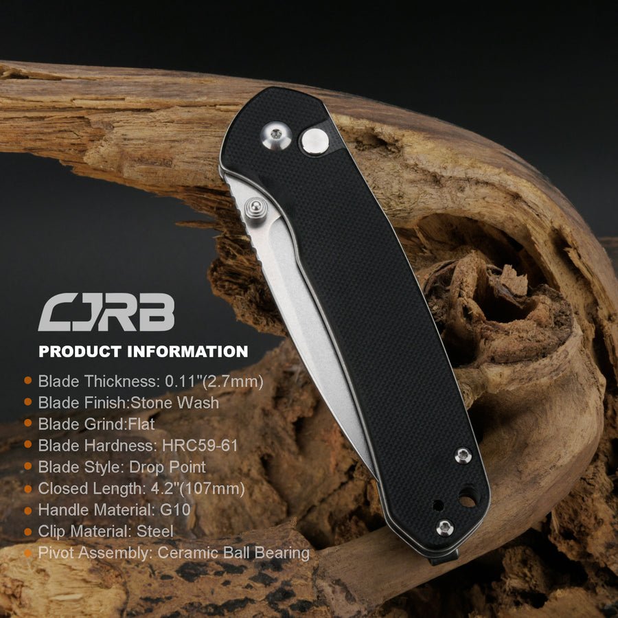 Pyrite - нова лінійка повсякденних складаних ножів в асортименті CJRB. Являє собою повнорозмірний, робочий інструмент для виконання різних завдань. Клинок профілю Drop Point виготовлений із сталі AR-RPM9 (Artisan-Rare Powdered Material 9 Element Steel). Ексклюзивна сталь має однорідну структуру, яка дозволяє зберігати гостру різальну кромку протягом тривалого періоду, проста в правці і відмінно витримує навантаження. Відкриття клинка відбувається за рахунок шпеника, а фіксується у відкритому положенні замком Button Lock. Покриття клинка та накладки на руків'ї можуть відрізнятися залежно від моделі. Клинок може мати обробку Stonewash або захисний, чорний PVD (Physical Vapor Deposition) покриття. Накладки можуть бути виготовлені з нержавіючої сталі або склотекстоліту G10 різних кольорів. На торці розміщений отвір для темляка та двостороння кишенькова кліпса.