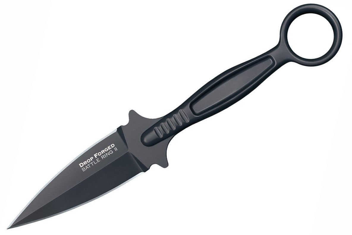 Drop Forged Battle Ring 2 викуваний, як і інші ножі цієї серії, із цільного шматка сталі, має подвійні гострі як бритва краю з голчастим вістрям, двосторонню гарту й кільце для пальця. Його рукоятка розрахована практично на будь-яку руку, а її контури точно запобігають ковзанню. Він підтримує вісім різних стилів хвата, його легко й швидко витягати, коли це необхідно. Ніж поставляється зі стійким до порізів чохлом Secure-Ex з ультрасучасним затиском Ulti-Clip™, що робить його надійним інструментом, з яким ви не захочете розставатися.