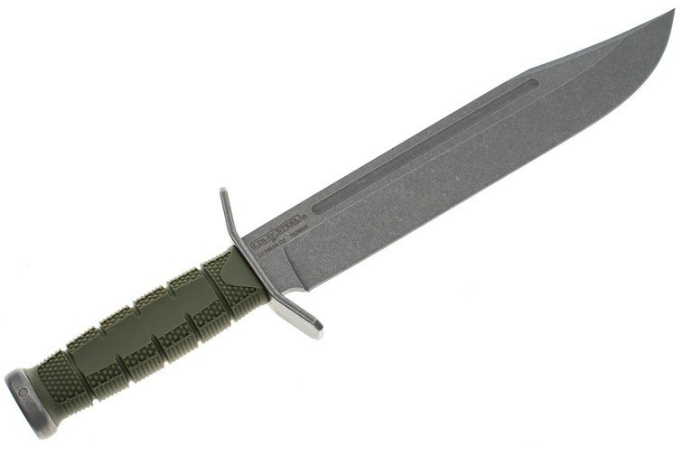 Lynn Thompson Leatherneck Bowie — це обмежена версія культового ножа з фіксованим клинком від Cold Steel. Ця фірмова серія Lynn Thompson, розроблена для використання в якості польового й тактичного інструмента на відкритому повітрі, привертає увагу колекціонерів завдяки невеликому індивідуальному серійному тиражу в 3000 екземплярів. Ця версія поставляється з лезом з німецької інструментальної сталі D2, обробленим методом стоунвошинга, із гравіруванням підпису й серійного номера, а також рукояттю OD Green Kray-Ex. Клинок з німецької інструментальної сталі D2 має вражаючий профіль Боуї, потужний інструмент для будь-якого серйозного завдання по різанню. Стоунвош на клинку приховує зношування, але при цьому чудово виглядає з подвійними долами, а фальш лезо й високі спуски дають неперевершений ріжучий потенціал. Після роботи протріть клинок начисто й злегка змажте маслом для захисту від корозії. Рукоять із Kray-Ex охоплює весь хвостовик, `обеспечиваякомфортное` втримання в будь-якому середовищі. Щоб захистити руку користувача від гострого клинка, компанія Cold Steel установила міцну сталеву подвійну гарду напроти сталевого тильника рукояті, що забезпечує добре збалансоване втримання в руці. У крайньому випадку, торець рукояті можна використовувати як молоток. Інструментальна сталь D2 використана в якості сталі для клинків із часів Другої світової війни. Вона пропонує гарну комбінацію твердості й зносостійкості з помірною ударною в'язкістю й стійкістю до корозії. Високий зміст хрому в інструментальній сталі (10-13%) надає D2 кращу корозійну стійкість, чому в більшості високовуглецевих сталей.