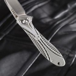 Замість традиційних шайб, які встановлюються між клинком і плажками рукояті, на цьому ножі використовується шарикопідшипникова система. Це забезпечує плавний хід клинка, високу надійність і практично повна відсутність люфтів.