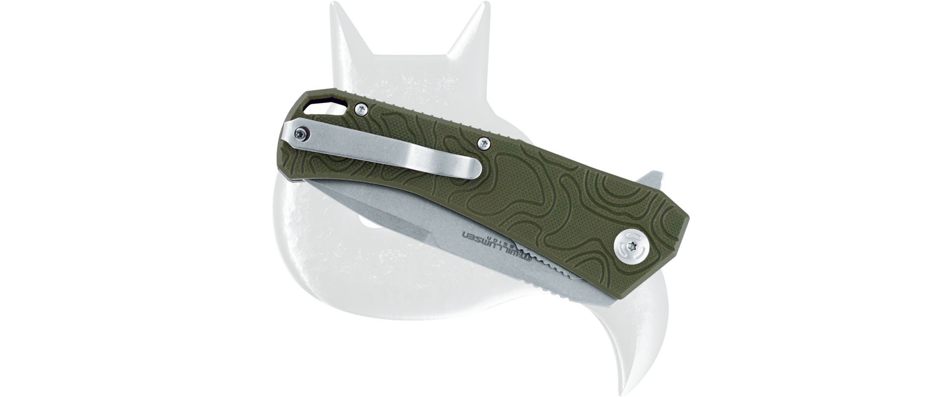 Echo 1 – ще одна новинка від ножового бренда Fox. Клинок виконаний у формі Drop Point з нержавіючої сталі 440С твердістю 57-59 HRC з покриттям Stonewash. Таке покриття має підвищену опірність до корозії й приховує подряпини, які можуть виникнути під час експлуатації. Фальшлезвіє, займаюче половину обуха, забезпечує ножу гарні проникаючі якості. Витягується клинок за допомогою фліппера, а на обуху розміщені насічки для упору великого пальця. Накладки рукояті виконані зі склотекстоліту G10 з фактурними візерунками. Матеріал відомий своїми властивостями витримувати високі ударні навантаження й має чіпку поверхню, що запобігає вислизанню. У розкритому виді клинок фіксується сталевою пластиною замка Liner Lock зі зручними насічками під палець. Кишенькова кліпса виконана з міцної нержавіючої сталі 420J2B. На торці розміщений отвір для темляка.