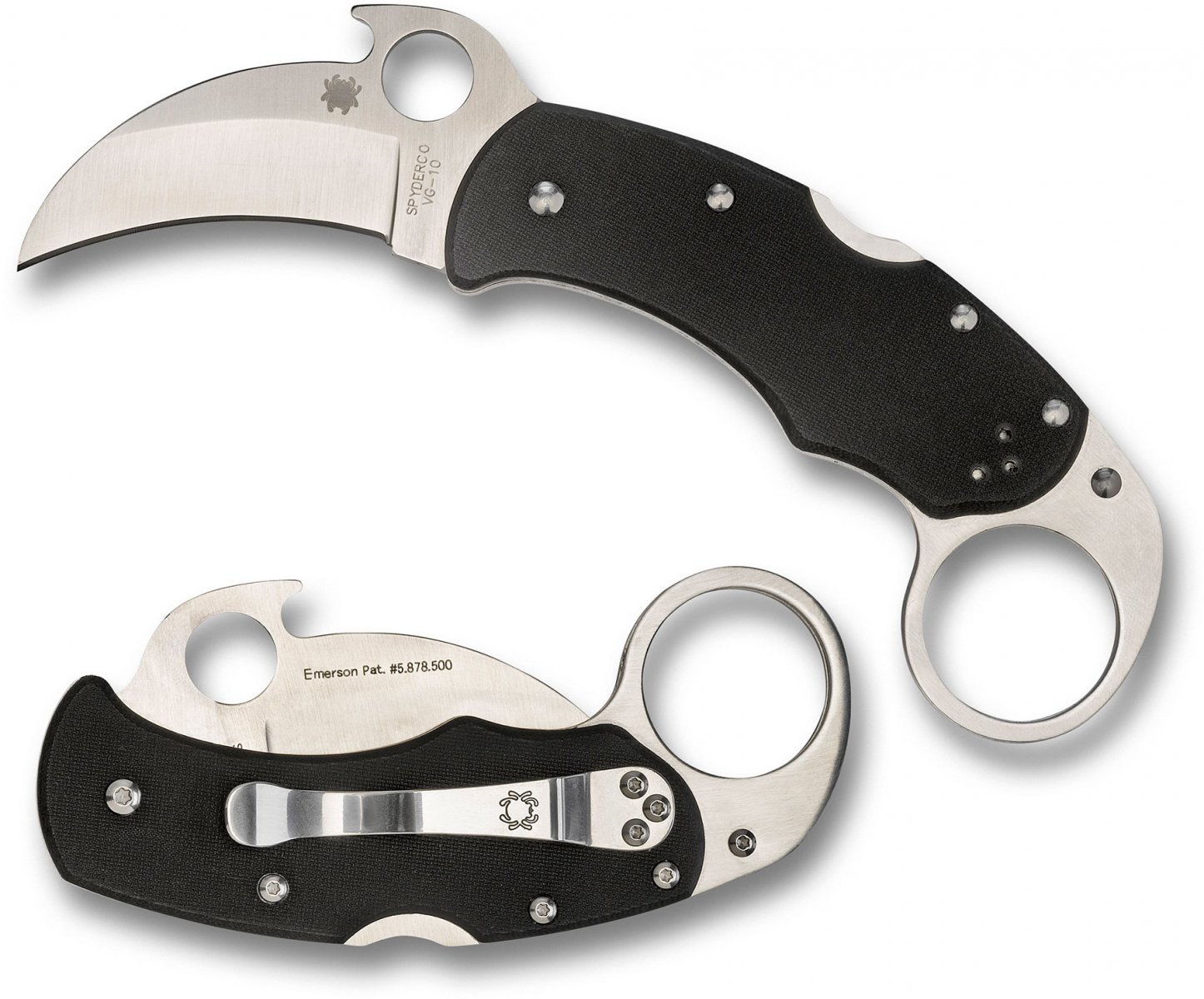 Його Hawkbill лезо виготовлене з Японської нержавіючої сталі VG-10 і оснащене запатентованими опціями відкриття Emerson's Wave Opening і Spyderco Round Hole.
