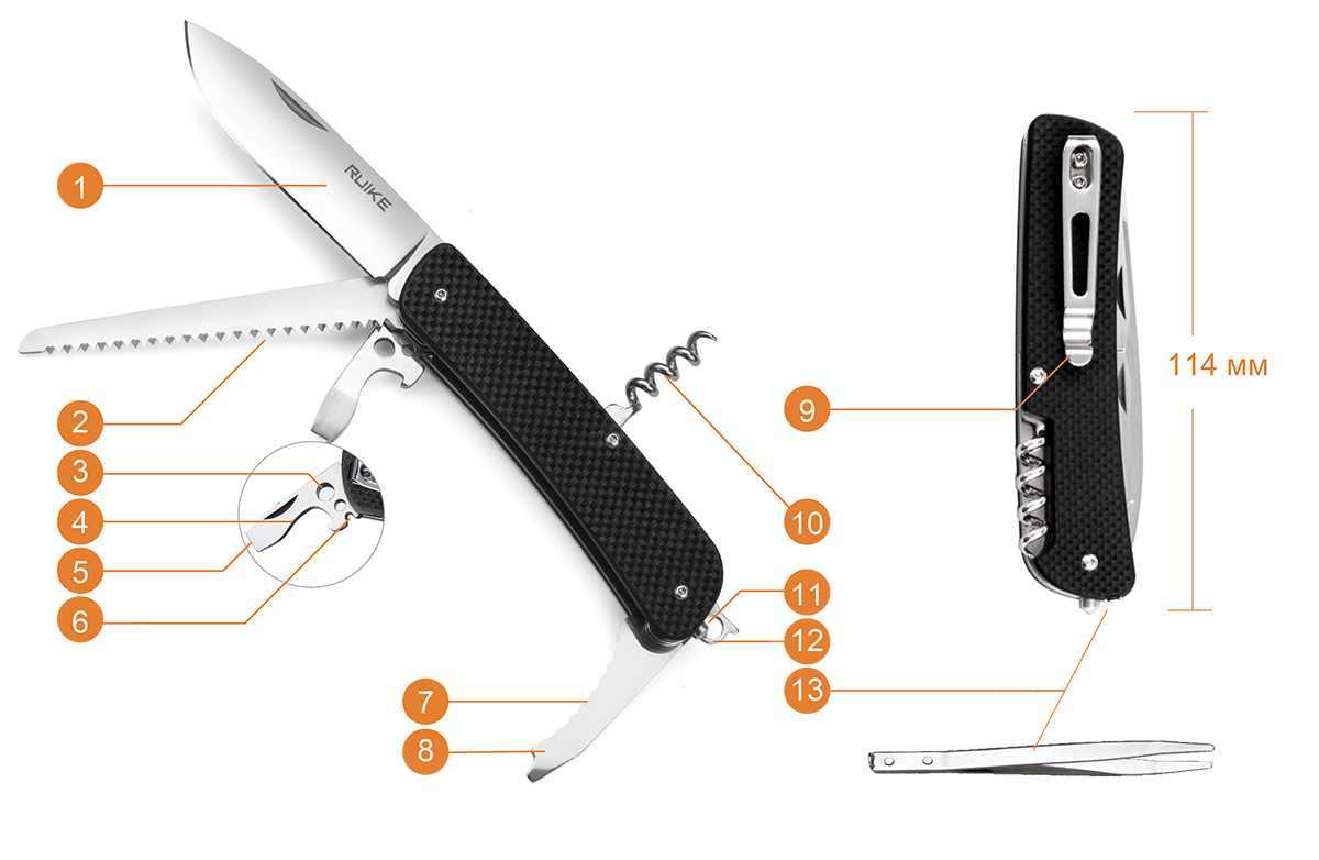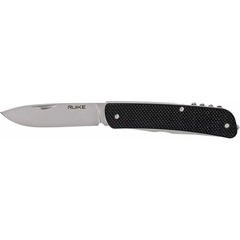 Бренд Ruike швидко набуває популярності, адже під ним випускаються якісні і довговічні складні ножі. Наприклад, модель L32 призначається для використання як на щоденній основі, так і в заміських поїздках. Це багатофункціональний ніж, в якому об'єднані відразу кілька корисних інструментів. Основним з них є гладко клинок заточений розміром 85 мм. Він має товщину по обуху 3 мм і цілком підходить для роботи не тільки з продуктами харчування, але і з різними іншими матеріалами. Для виготовлення всіх інструментів використовується нержавіюча сталь марки12С27. Це нержавійка шведського виробництва, що широко застосовується у виробництві туристичних та інших ножів. Її якості добре збалансовані і метал є одночасно твердим, але не тендітною, корозійностійким, добре зберігає заточку. До її складу входять такі легуючі елементи, як хром, марганець, молібден і кремній. Ця сталь загартовується при низьких температурах до твердості 58-59.