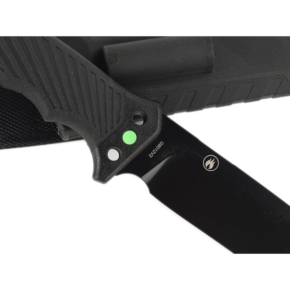 Ніж Ganzo G8012V2-BK - яскравий приклад надійного інструменту, який не боїться складних завдань. Його клинок виготовлений з високовуглецевої стали 8CR13 з твердістю 58 HRC, що поєднує якості, які необхідні справжньому ножу для виживання. Завдяки високому вмісту хрому, сталь несприйнятлива до появи корозії і має тривалий термін служби. Ріжуча кромка надовго зберігає свою гостроту і ефективно працює навіть з твердими сортами деревини, що стане в нагоді під час відпочинку на природі. За рахунок ширини клинка, яка дорівнює 5 міліметрів, досягається підвищена надійність інструменту при інтенсивних і тривалих навантаженнях. Клинок з прямим заточуванням має темне матове покриття, які приховує невеликі подряпини на лезі.