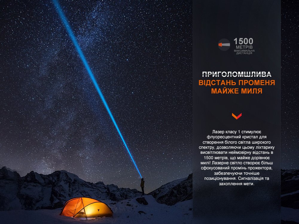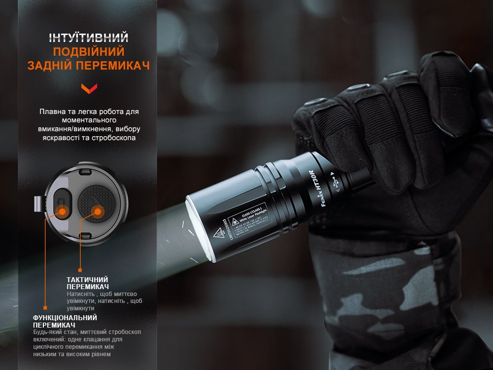 Модель Fenix HT30R є лазерним ліхтарем, який демонструє велику продуктивність та потужність. Лазер класу 1 стимулює флуоресцентний кристал для генерації білого світла широкого спектру, дозволяючи висвітлювати на відстані 1500 метрів – це понад один кілометр!