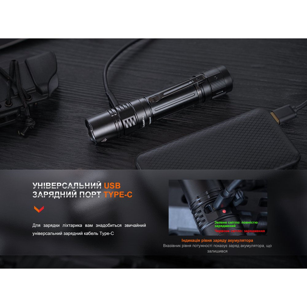 Серцем приладу є акумулятор Fenix ARB-L21 форм-фактора 21700 ємністю 5000 мАч, що йде у базовій комплектації. Заряд батареї можна заповнювати без виймання з батарейного відсіку – для цього призначений прихований USB-порт Type-C. До порту приєднується зарядний кабель із комплекту, за допомогою якого акумулятор заряджається за 3 години з 0% до 100%. Процес заряджання відстежується за рахунок кольорового індикатора: червоний колір – акумулятор заряджається, зелений – елемент живлення повністю заряджений. Порт знаходиться під силіконовою заглушкою, що перешкоджає попаданню засмічень усередину.