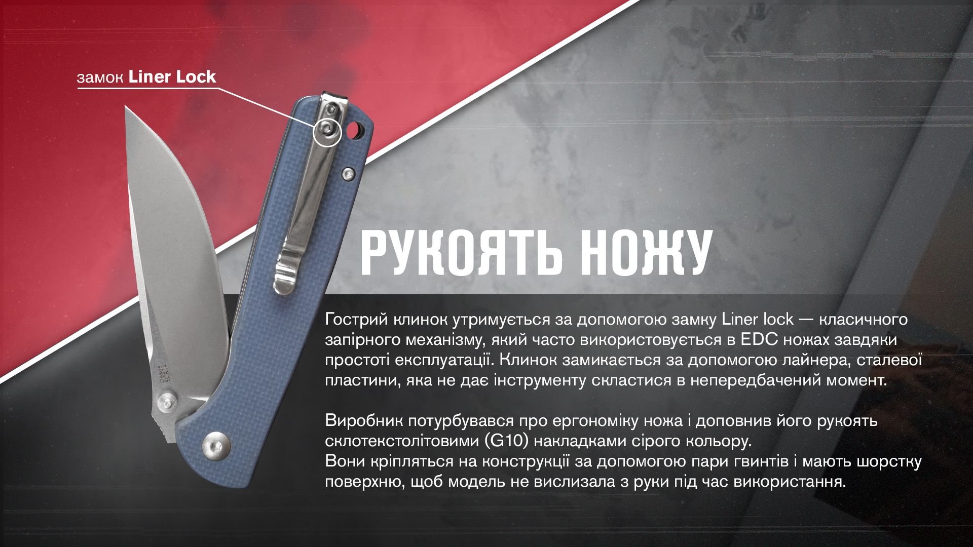 Гострий клинок Ganzo g6805 утримується за допомогою замка Liner lock — класичного запірного механізму, який часто використовується в EDC ножах завдяки простоті експлуатації. Клинок замикається за допомогою лайнера, сталевої пластини, яка не дає інструменту скластися в непередбачений момент.