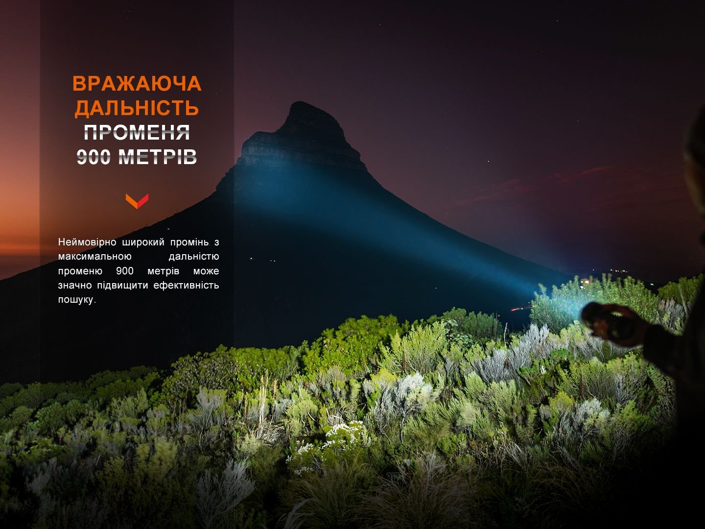Пошукова модель LR40R V2.0 від Fenix виділяється не тільки яскравістю світла та великим набором режимів, а й відчутно компактнішими габаритами у порівнянні з освітлювальними пристроями аналогічного типу від інших виробників. Ліхтар можна утримувати однією рукою, і при цьому його функціонал вражає наявністю цілих сімнадцяти світлодіодів (1 x Luminus SFT70, 16 x Lumileds HL2X), які генерують над’яскравий світловий потік до 15 000 люмен.