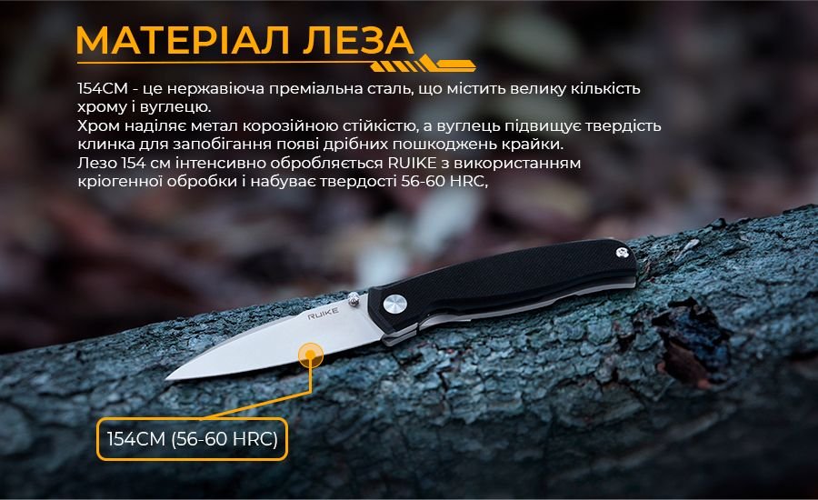Для надання клинку високої міцності та довговічності, у його виробництві використовується сталь 154СМ. Вона є преміальною маркою, що містить велику кількість хрому (±14%) і вуглецю (1.1%). Хром наділяє метал корозійною стійкістю, а вуглець підвищує твердість клинка для запобігання появі дрібних пошкоджень крайки.
