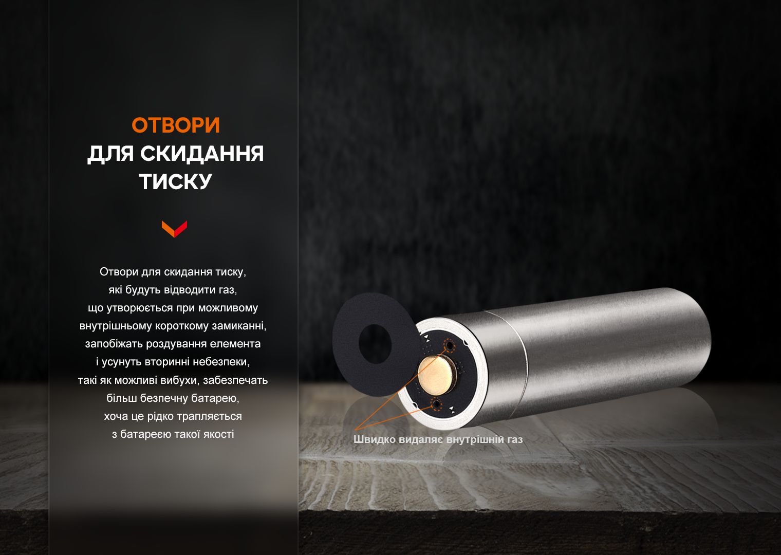 Корпус виготовлений зі сталі, тому не схильний до пошкоджень і деформування у разі падіння з висоти. Пара отворів в акумуляторі відповідають за скидання надлишкового тиску та захищені тонкою плівкою, що виступає бар'єром для пилу та вологи.