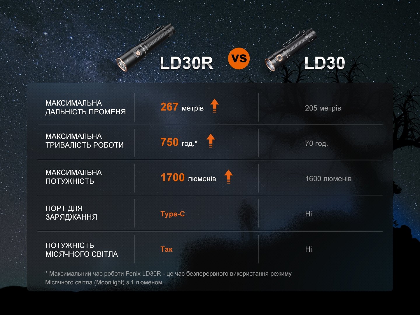 Потужний, міцний і легкий — ліхтар Fenix LD30R має всі ці характеристики, претендуючи на звання чи не найкращої EDC моделі серед аналогічних освітлювальних пристроїв в асортименті бренду. Завдяки компактним розмірам, ліхтар можна носити з собою на повсякденні прогулянки для підсвічування дороги в темний час доби. При цьому його захищеність від вологи та яскравість, що досягає 1700 люмен, актуальні для любителів подорожей та активного відпочинку, для яких потужне та довговічне джерело освітлення є гарантом не лише комфорту, а й безпеки.