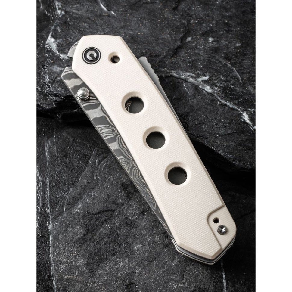 Довжина клинка становить 89.9 мм, а його товщина в обуху дорівнює 3 мм. Клинок виготовлений з висококласної дамаської сталі твердістю близько 58-60 HRC. Метал легко справляється з різанням матеріалів різної щільності — від картону і харчових продуктів до пластику і деревини. Крім того, дамаск демонструє непогану корозійну стійкість і, звичайно, має унікальні візерунки на поверхні, які служать неповторною прикрасою загального дизайну конструкції.