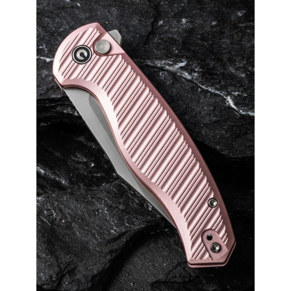 Модель має складану конструкцію: 83.8 мм припадають на клинок з прямим заточуванням, а 110.3 мм — на руківʼя ніжно-рожевого відтінку. Для розкриття леза достатньо натиснути на плавець фліпера, після чого ніж миттєво відкривається до фіксації, за яку відповідає замок button lock. Виробник приділив особливу увагу механіці та укомплектував інструмент керамічними підшипниками, що значно покращило плавність ходу леза.
