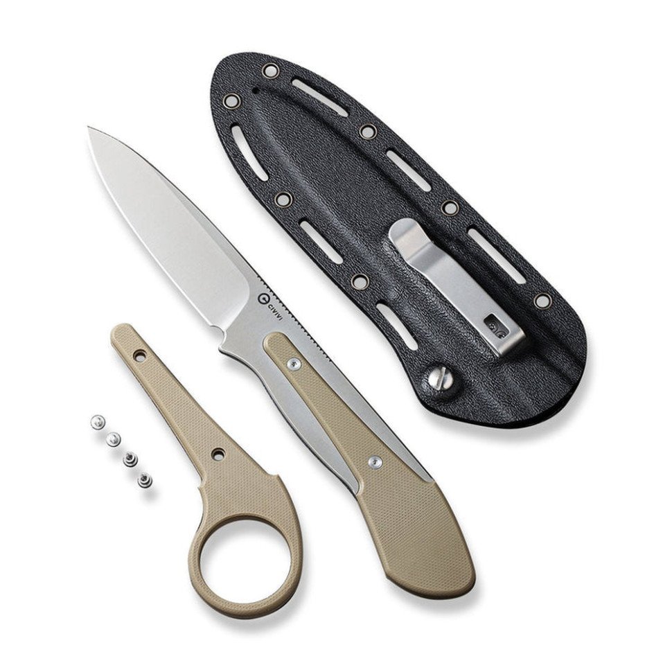 Головна ж особливість ножа Civivi Varius — унікальна конструкція з можливістю кастомізації руківʼя за допомогою 2 типів накладок на вибір: класичних прямих або з хвостовим отвором. Накладки входять до комплекту разом із двома парами кріплень, пропонуючи розширену кількість варіантів хвату руківʼя. Матеріал накладок — склопластик G10 з шорсткою поверхнею, яка не дає долоні ковзати по руківʼю.