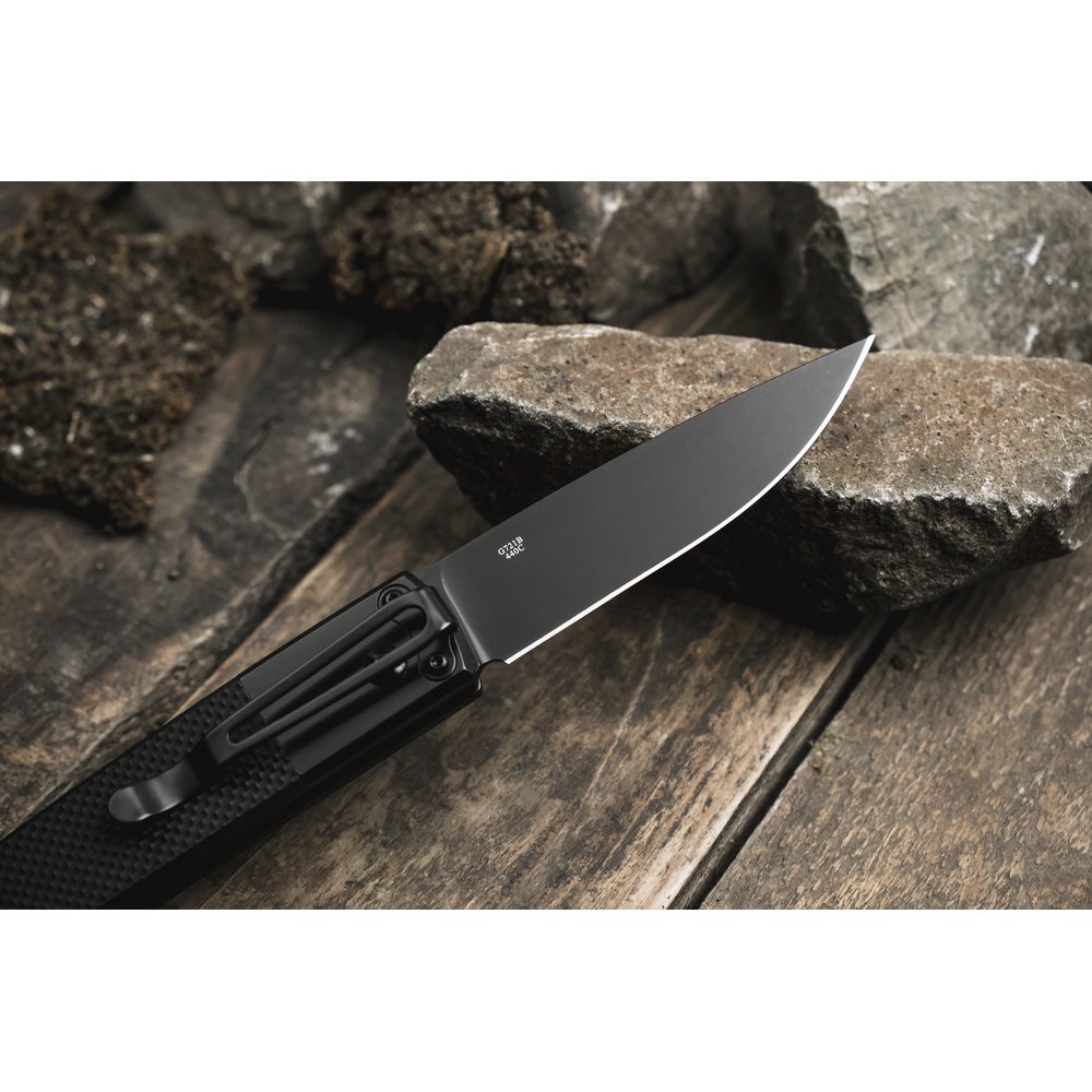 - Сталь 440С в клинку має нержавіючі властивості та надовго зберігає гостроту після заточування, тому не вимагає спеціального догляду. До того ж метал загартований до твердості ±58 HRC, що в сукупності з чорним зміцнювальним покриттям підвищує ефективність роботи зі щільними матеріалами, як пластик або деревина.