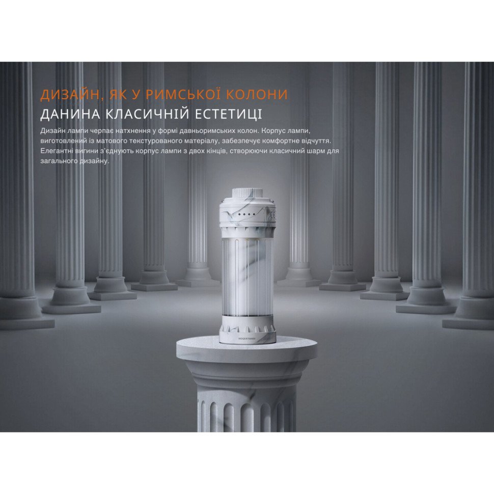 Широкий набір з 12 режимів яскравістю до 500 лм та надтривалий час роботи на одному заряді (до 200 год) роблять Fenix CL22R актуальним вибором не лише для кемпінгу та туристичних подорожей. Ліхтар також можна використовувати в домашніх умовах у разі відключення електроенергії, тоді як стильний корпус з дизайном, що нагадує римську колону, стане прикрасою будь-якого інтер'єру.