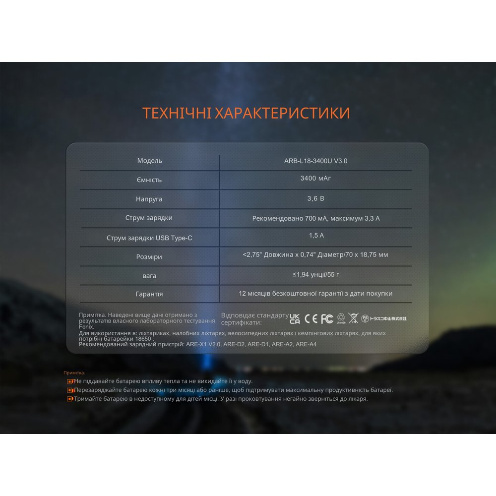 Опис акумулятора 18650 Fenix (3400 mAh) Type-C: