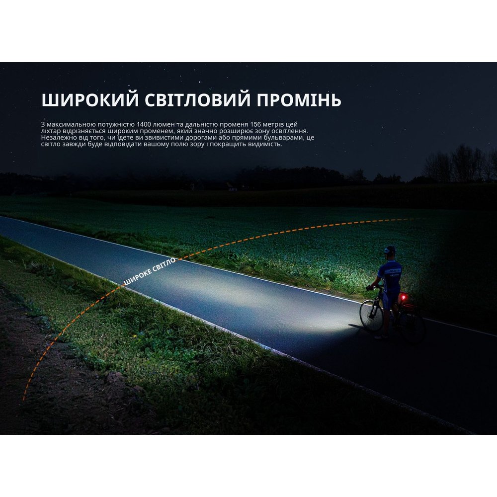 Велофара Fenix BC22R, Li-ion акумулятор ARB-L18-3400, зарядний кабель USB-C, велосипедне кріплення з адаптером, запасне ущільнювальне кільце, інструкція користувача, гарантійний талон.