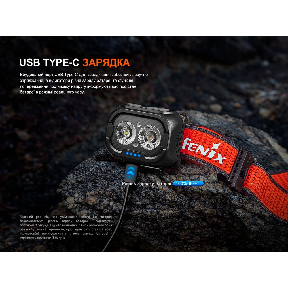 Fenix HL18R-T V2.0 постачається у комплекті з Li-pol акумулятором фірмового виробництва та заряджається через порт USB Type-C, розташований у нижній частині корпусу та закритий захисною заглушкою.