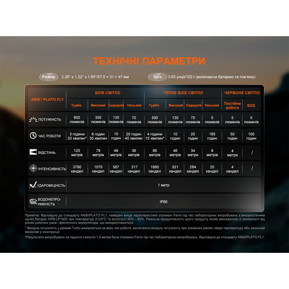 - джерело живлення – 1 х Fenix ARB-LP1900 / 3 х ААА;