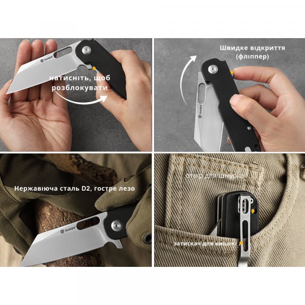 Ніж Ganzo G770 — компактний універсал в асортименті складаних інструментів Ganzo. Різати, пиляти, проколювати та надрізати — модель справляється з будь-яким завданням з однаковою ефективністю завдяки клинку з профілем wharncliffe, що має подовжену різальну кромку та загострений кінчик для тонких робіт.