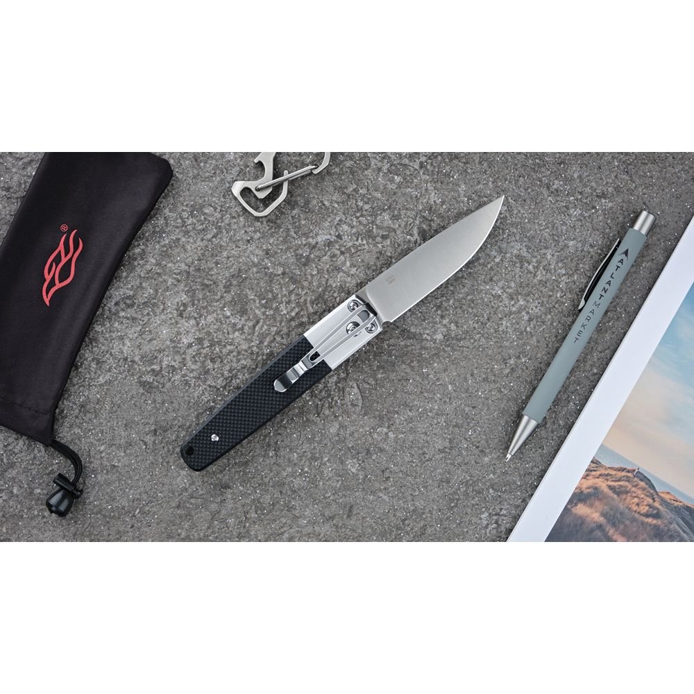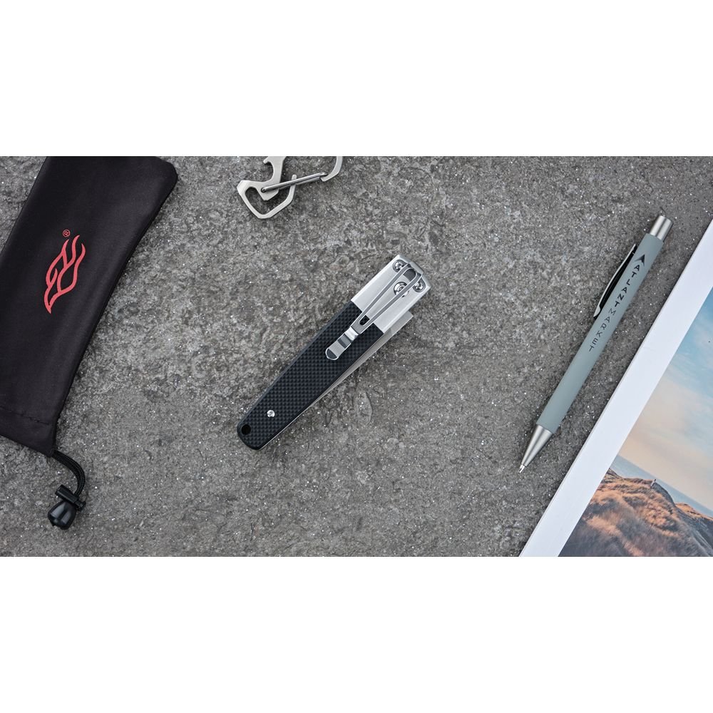 Рукоятка також частково зроблена зі сталі. Другий використовується для її матеріал — сучасний полімер G10. Це дуже міцне і довговічне композитне волокно. Поверхня рукоятки — текстурована, що покращує її зчеплення з долонею. На внутрішній стороні розташована металева кліпса для приєднання до поясного ременя або фіксації в кишені. Ця невелика деталь дозволяє тримати ніж під рукою і не втратити його.