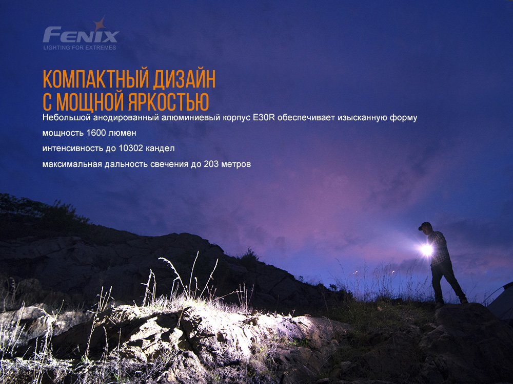 Модель Fenix E30R добре пристосована для використання практично в будь-яких умовах. У цього ліхтарика алюмінієва оболонка з жорстким анодуванням. Він захистить від ударів, вібрації, подряпин та інших механічних пошкоджень. Ліхтар не постраждає після падіння на камені з висоти приблизно 2 метрів. Корпус також зроблений водонепроникним. Fenix E30R можна занурювати під воду на глибину приблизно на 2 метри і залишати там до півгодини.