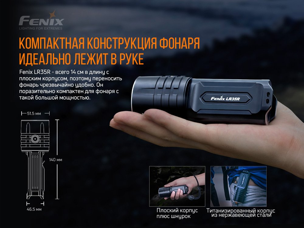 Модель Fenix LR35R являє собою єдиний у своєму роді ліхтар з найбільшою яскравістю 10000 люменів в такому маленькому корпусі. Пристрій позиціонується, як пошуковий варіант, і його промінь світла долає дистанцію п'ятсот метрів. В наборі разом з ліхтарем йдуть дві літій-іонні батареї ємністю 4000 маг кожна форм-фактора 21700. Вихідний струм – 30 ампер. Батареї можна заряджати за допомогою порту USB Type-C. Кут прожектора в 90 градусів сприяє дослідницьких, пошукових і рятувальних видами діяльності. Індикатор ступеня зарядженості покаже рівень заряду батарей.