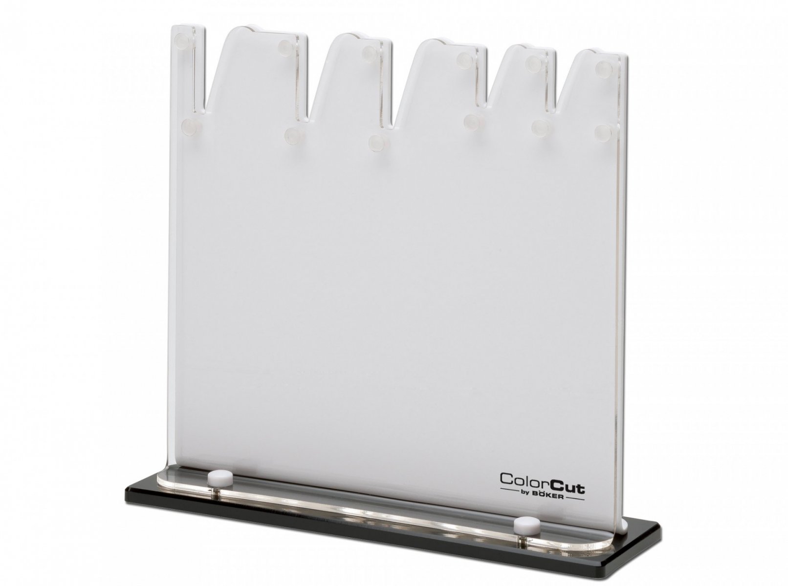 Boker Manufaktur Solingen - ножі найвищого класу! C 1869-го року й дотепер проводяться на фабриці Boker у місті Золінген, Німеччина. Нова колекція Boker Colorcut представлено п'ятьма типами кухонних ножів різних квітів і призначень: Colorcut Bread, Colorcut Santoku, Colorcut Utility, Colorcut Vegetable, Colorcut Chef. Клинки з нержавіючої хром- молібденової сталі в комбінації зі спеціальним покриттям забезпечують рівний і чистий рез. Ергономічна рукоять виготовлена із двох синтетичних матеріалів: білої щільної основи й неслизьких кольорових вставок для зручного й надійного втримання ножа навіть мокрою рукою. Кожний виріб іде в комплекті з відповідної захисною накладкою – для безпечного зберігання. Підставка Boker Colorcut призначена для зручного й безпечного зберігання кухонних ножів. Завдяки своєму сучасному дизайну вона прикрасить будь-яку кухню. • Розрахована на п'ять ножів серії Colorcut. • Матеріал: акрил. • Легко миється. • Досить стійка. • Ножі в комплект не входять.