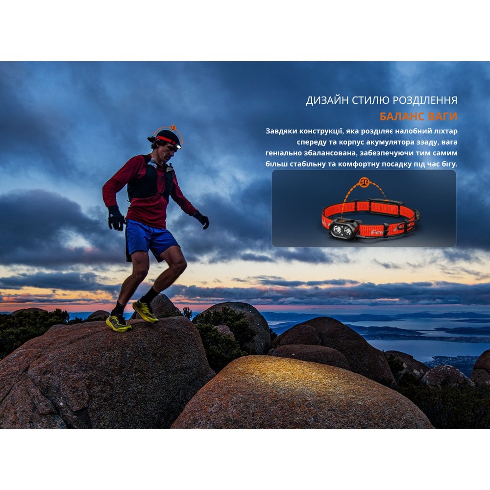 Головна особливість Fenix HP12R-T — батарейний блок, винесений на задню частину налобного кріплення. Таке рішення дозволяє збалансувати вагу між корпусом ліхтаря та батарейним відсіком, запобігаючи ковзанню конструкції на голові під час активного руху.