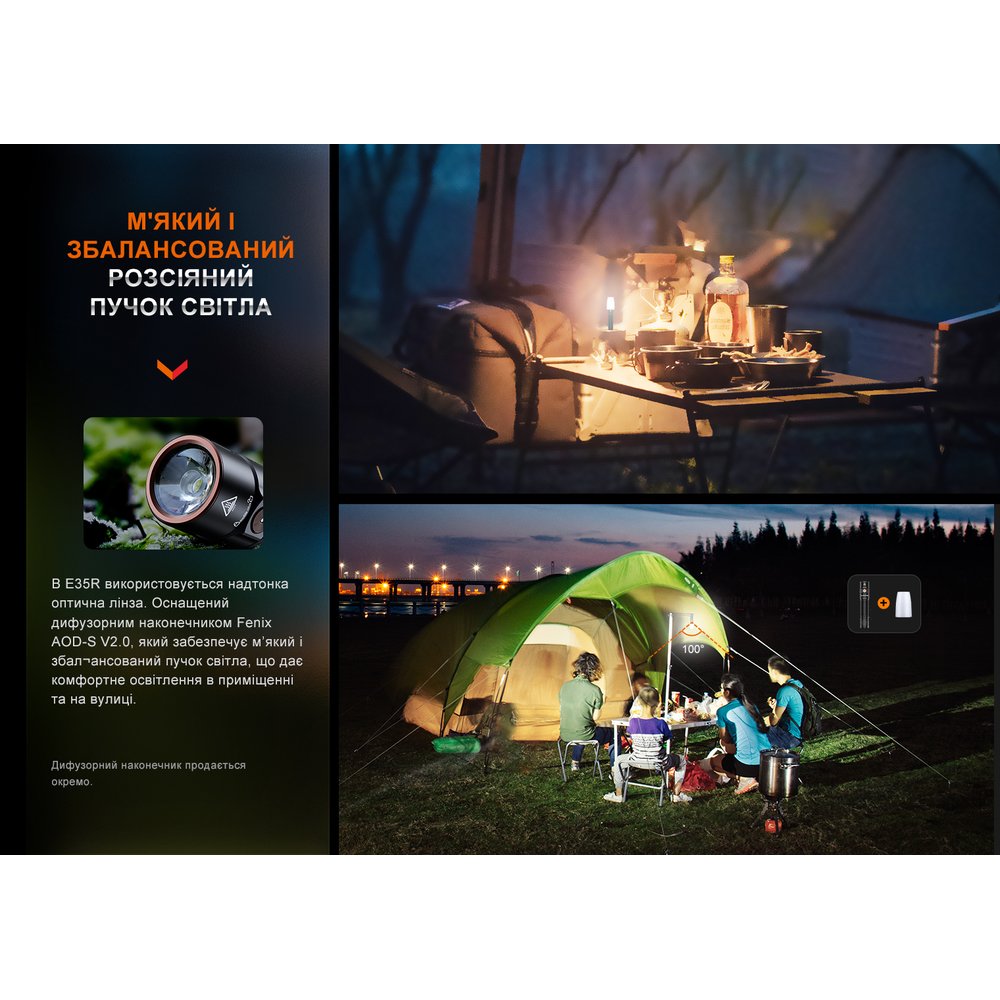 EDC-ліхтар Fenix E35R закриває всі завдання з освітлення у побуті та на просто неба: на риболовлі, у поїздках і професійних цілях. У порівнянні з попередньою версією E35 V3.0, ця модель отримала помітний приріст потужності променя: максимальний світловий потік тепер сягає 3100 люменів, а далекобійність — 260 м.