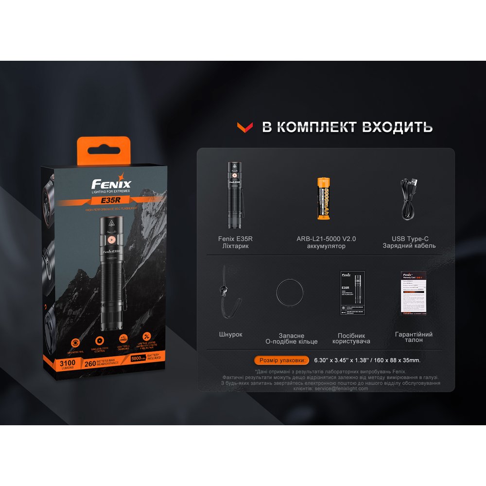 Ліхтар Fenix E35R зі знімною кліпсою, акумулятор Fenix 5000 мА·год, темляк на руку, кабель USB-C для заряджання, гарантійний талон, посібник з експлуатації.