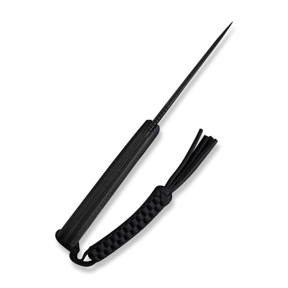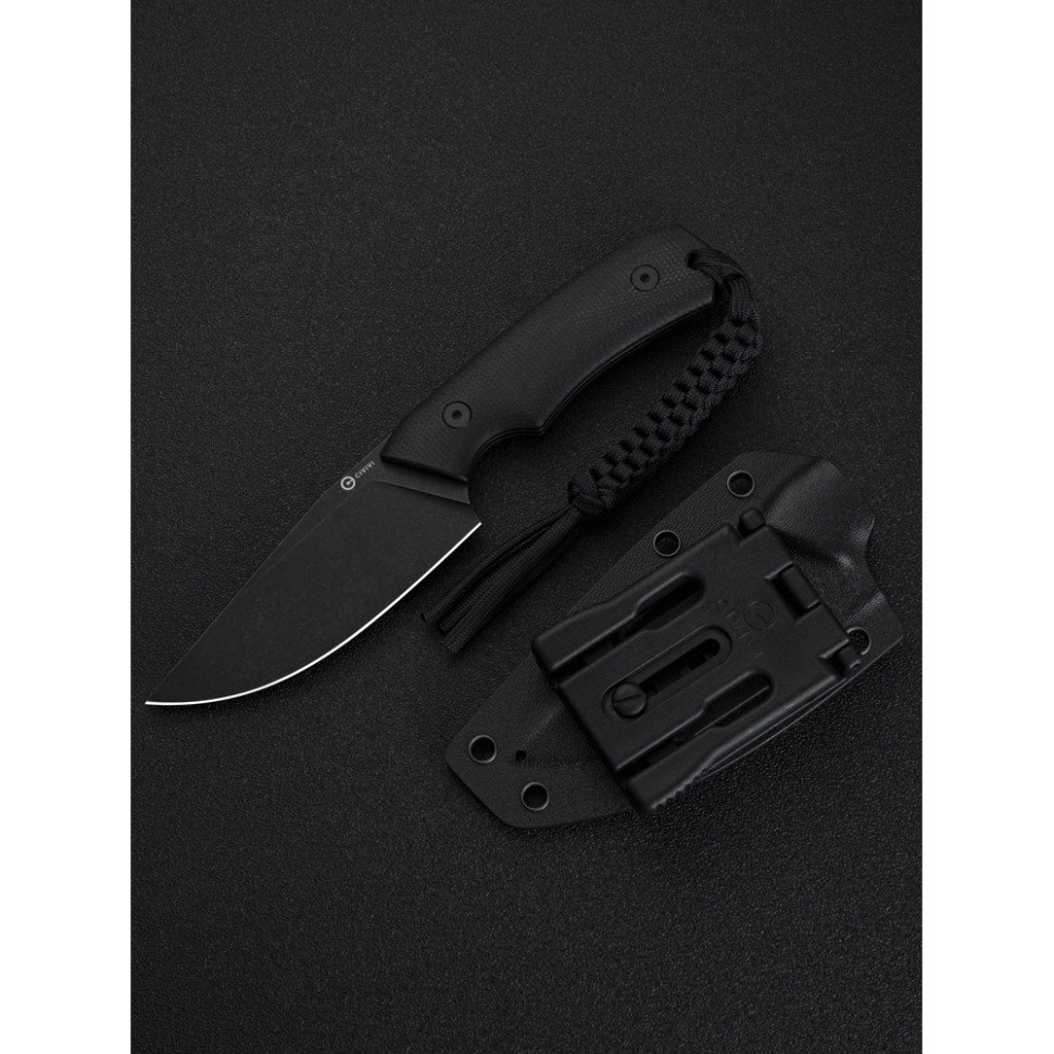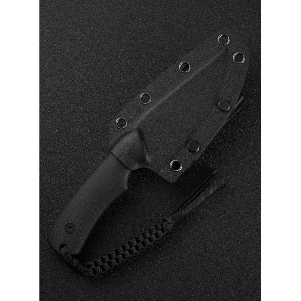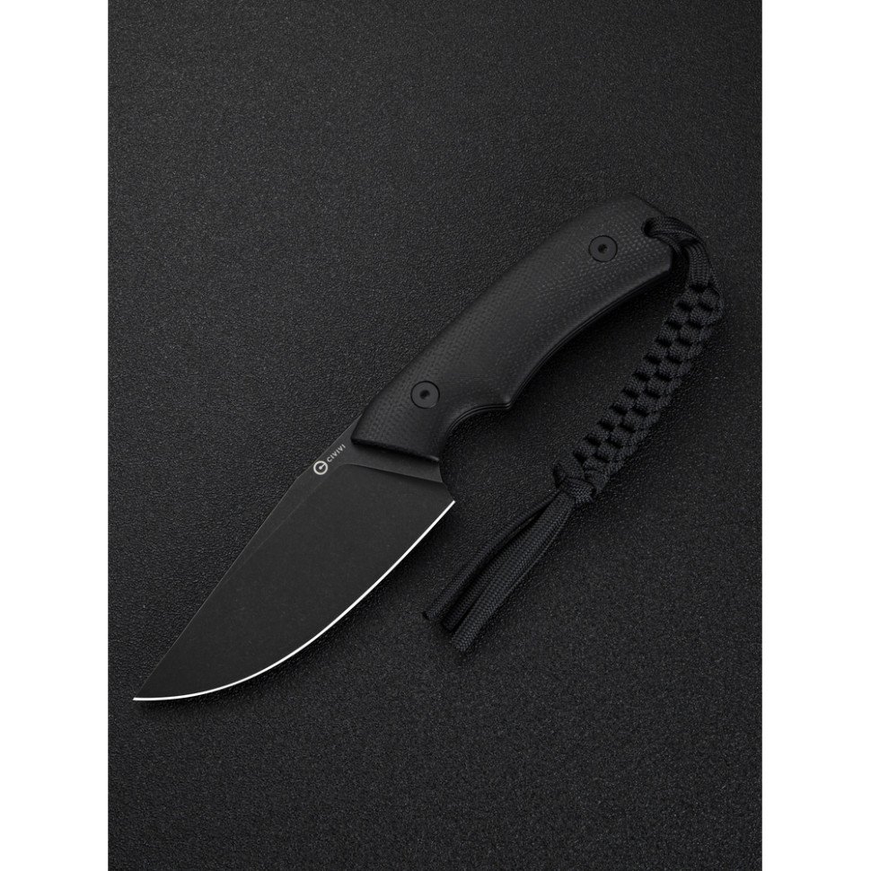 - Клинок з нержавіючої сталі Sandvik 14C28N. Це високоякісна шведська марка з високою корозійною стійкістю та твердістю 58–60 HRC. Метал легкий в обслуговуванні, а обробка методом галтування з чорним покриттям приховує відбитки пальців.