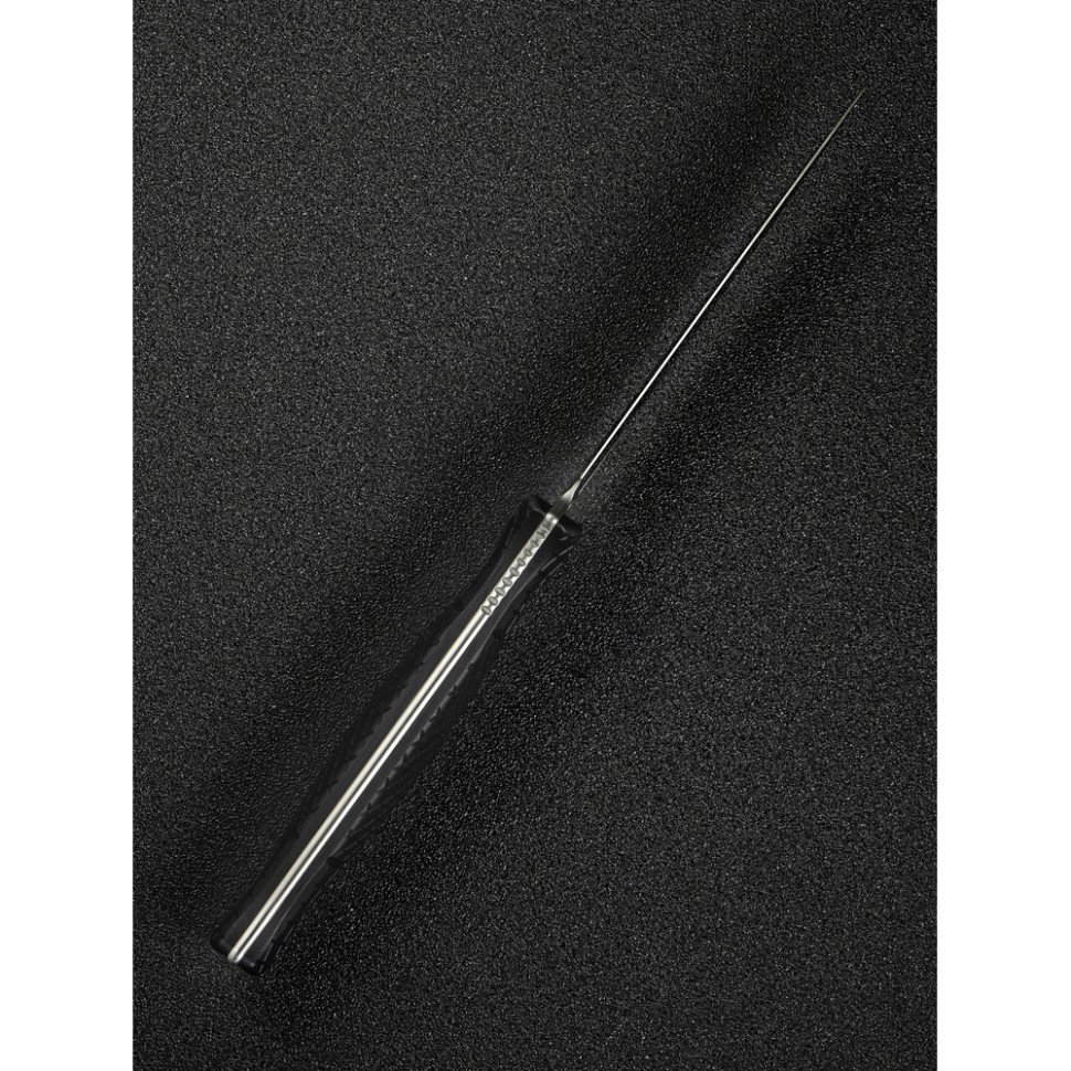- Клинок з нержавіючої сталі Sandvik 14C28N. Шведський сплав з дрібнозернистою структурою загартований до твердості 58–60 HRC, що робить кінчик міцним, а лезо особливо гострим без необхідності частого гостріння.