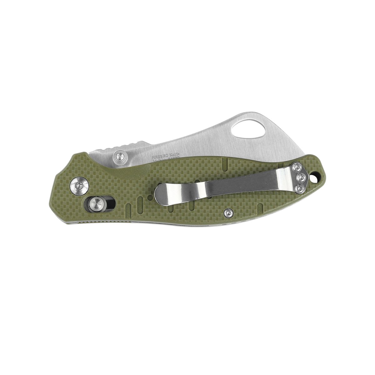 Рукоятка ножа цієї моделі продумана нітрохи не гірше, ніж клинок. Вона зроблена з G10. Це сучасний композитний матеріал з високим рівнем міцності і малою вагою. Він легко обробляється і приймає потрібну форму. Також склопластик не вицвітає на сонці і абсолютно не вбирає воду. Ручка ножа моделі Firebird F7551 може бути пофарбована в чорний, помаранчевий або зелений колір. Її поверхня спеціально зроблена не рівною, щоб навіть в мокрих руках ніж не ковзає. На краю ручки є отвір, у який можна протягнути темляк. Також до ручки трьома невеликими болтами прикручена сталева кліпса для фіксації Firebird F7551 в кишені.
