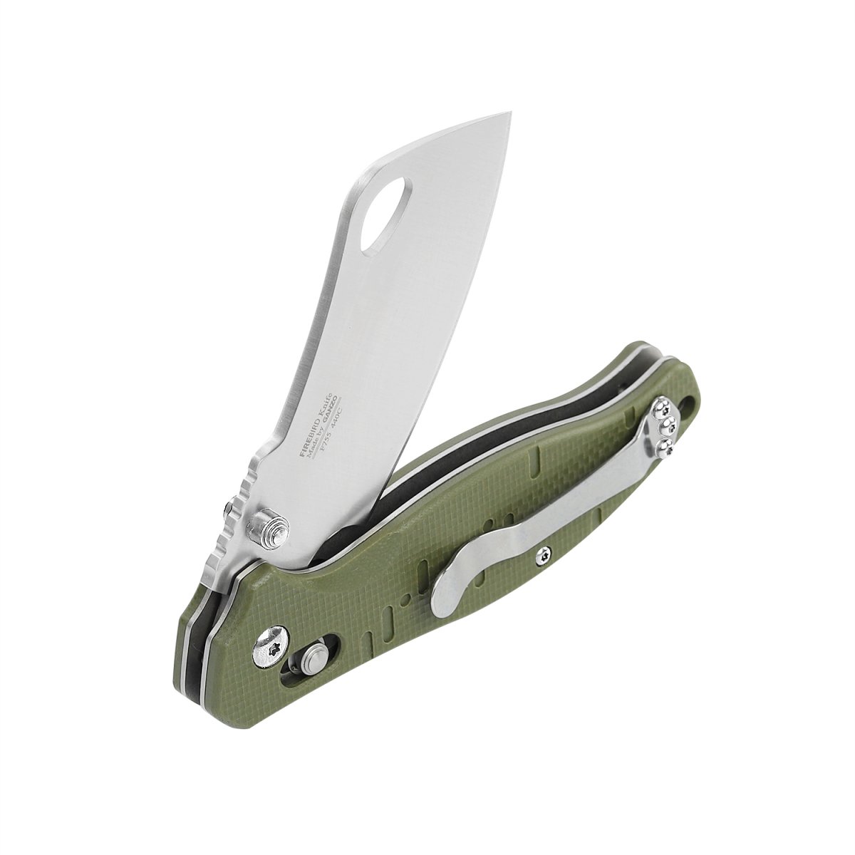 Розмір по довжині леза становить 85 мм. Воно по всій довжині гладко заточене. Товщина клинка досить солідна і становить 3,3 мм. Таким ножем можна різати навіть тверді матеріали, не побоюючись, що воно може выщербиться. Форма клинка в моделі Firebird F7551 називається Sheepfoot. Вона зустрічається не часто, а тому обов'язково буде помічена всіма поціновувачами оригінальних ножів. Обух такого клинка дуже сильно вигнутий і різко опускається до ріжучої кромки. Хоча на кінці леза є гострий кінчик, ним набагато зручніше різати, ніж колоти.