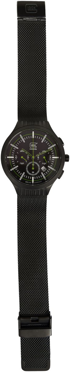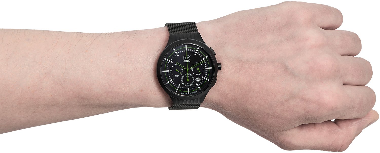 Glock Chrono Set GWC0001 35Years Glock USA – это часы, созданные командой GLOCK по случаю празднования 35-річчя открытия штаб-квартиры в Смирне, штат Джорджия, США. Часы содержит солнечный элемент под циферблатом, который превращает любую форму света на "электрическую энергию" и сохраняет ее во вторичной батарее. В отличие от обычных кварцевых часов, в этих часах не используется батарейка из оксида серебра, которое отстраняет необходимость замены элемента питания. Время работы от полного заряда к остановки будет составлять близко 6 месяцев, а функция предупреждения о разрядке (движение секундной стрелки с интервалом в две секунды являются сигналом о разряде батарейки) позволит своевременно подзарядить часы от искусственного или солнечного света. Время беспрерывной работы часов после движения секундной стрелки с двухсекундным интервалом составляет приблизительно одна неделя. Часы Glock Chrono Set GWC0001 35Years Glock USA имеет еще одну интересную особенность, - если вторичная батарея заряжена полностью, срабатывает функция предотвращения перезаряда, во избежание ухудшение состояния и выход ее з порядка