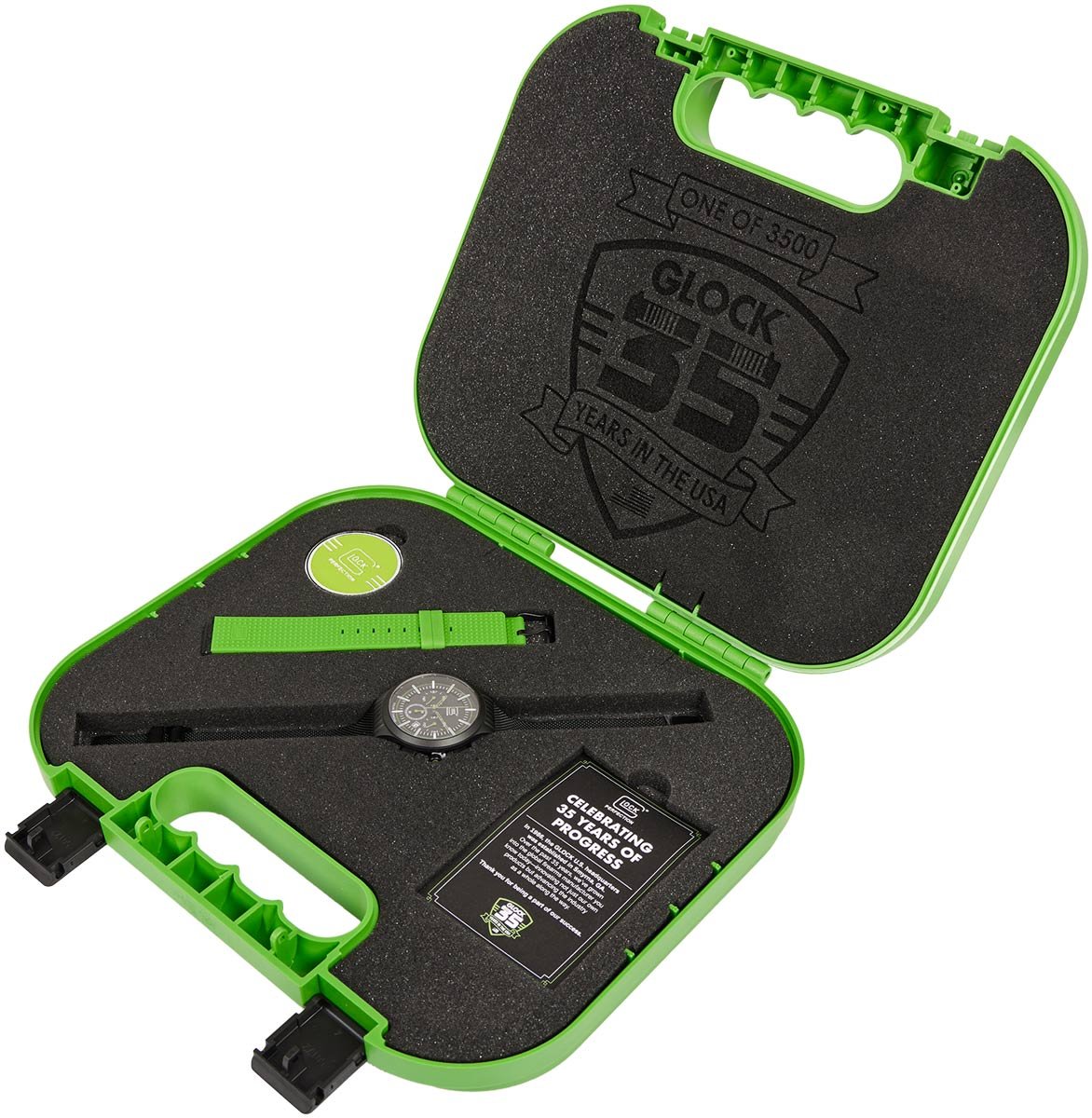 Хронограф Glock Chrono Set GWC0001 35Years Glock USA поставляется в фирменном защитном кейсе ярко зеленого цвета, в котором находится челлендж-монета, подписанная открытка, инструкция по использованию, а также сетчатый ремешок из нержавеющий стали с покрытием ndlc (нитридное алмазообразное покрытие) и силиконовый ремешок в цвет кейсу. Оба браслеты имеют лазерную гравировку эмблемы GLOCK на застежке