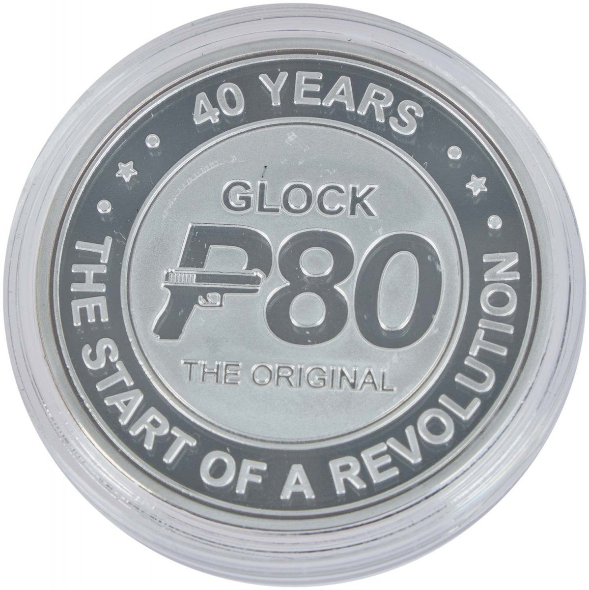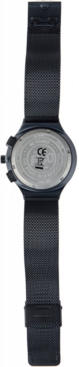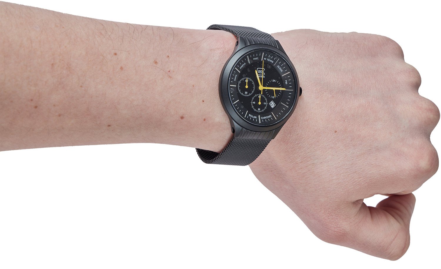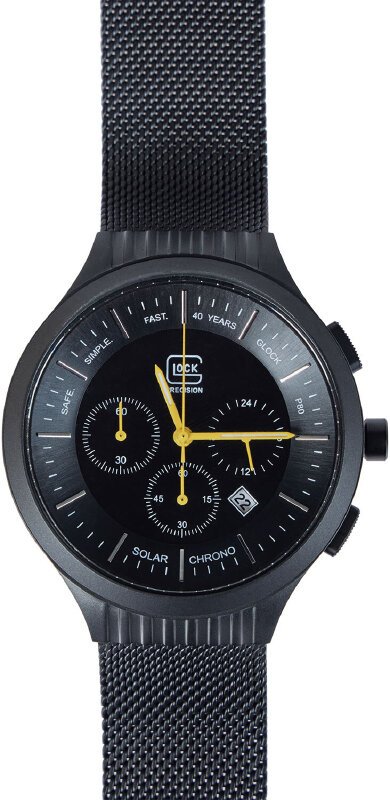 Glock Watch Chrono SET GWC0002 LE 40 – это часы, созданные командой GLOCK по случаю празднования 40-годовщина легендарной модели пистолета GLOCK P80. Часы содержит солнечный элемент под циферблатом, который превращает любую форму света на "электрическую энергию" и сохраняет ее во вторичной батарее. В отличие от обычных кварцевых часов, в этих часах не используется батарейка из оксида серебра, которое отстраняет необходимость замены элемента питания. Время работы от полного заряда к остановки будет составлять близко 6 месяцев, а функция предупреждения о разрядке (движение секундной стрелки с интервалом в две секунды являются сигналом о разряде батарейки) позволит своевременно подзарядить часы от искусственного или солнечного света. Время беспрерывной работы часов после движения секундной стрелки с двухсекундным интервалом составляет приблизительно одна неделя. Часы Glock Watch Chrono SET GWC0002 LE 40 имеет еще одну интересную особенность, - если вторичная батарея заряжена полностью, срабатывает функция предотвращения перезаряда, во избежание ухудшение состояния и выход ее з порядка