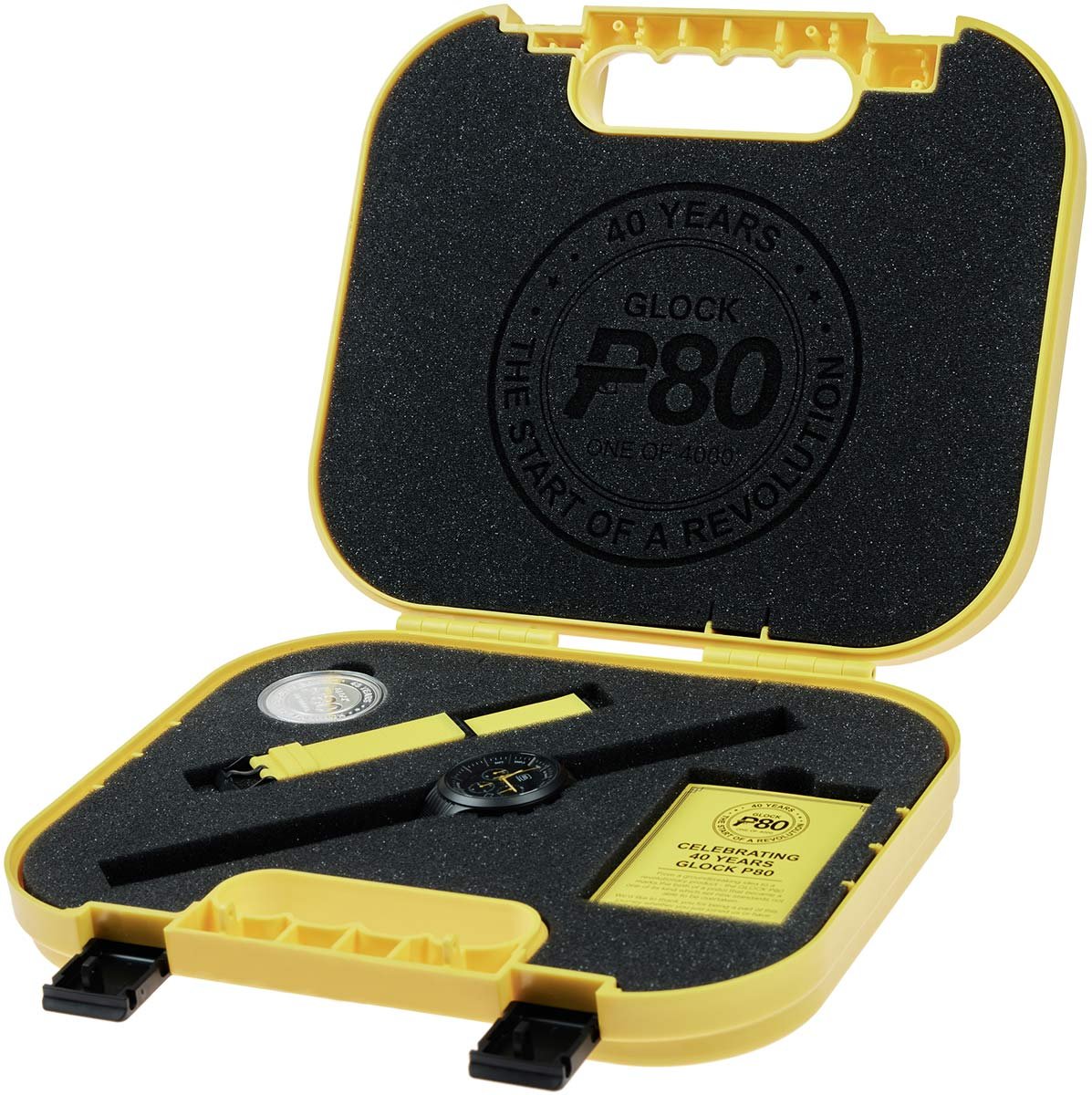Хронограф Glock Watch Chrono SET GWC0002 LE 40 поставляется в фирменном защитном кейсе желтого цвета, в котором находится челлендж-монета в пластиковом футляре, подписанная открытка, инструкция по использованию, а также сетчатый ремешок из нержавеющий стали с покрытием ndlc (нитридное алмазообразное покрытие) и желтый силиконовый ремешок. Оба браслеты имеют лазерную гравировку эмблемы GLOCK.